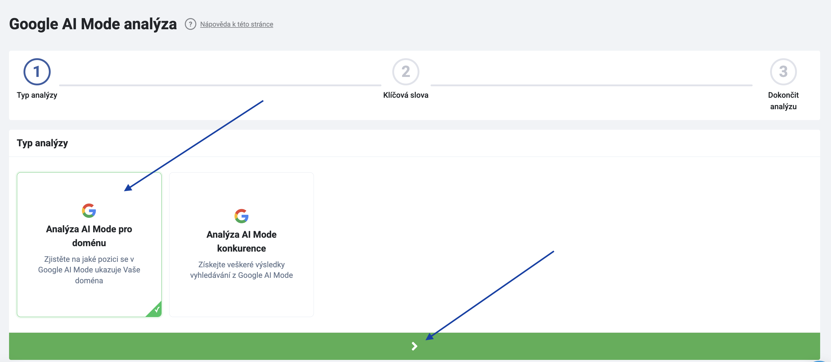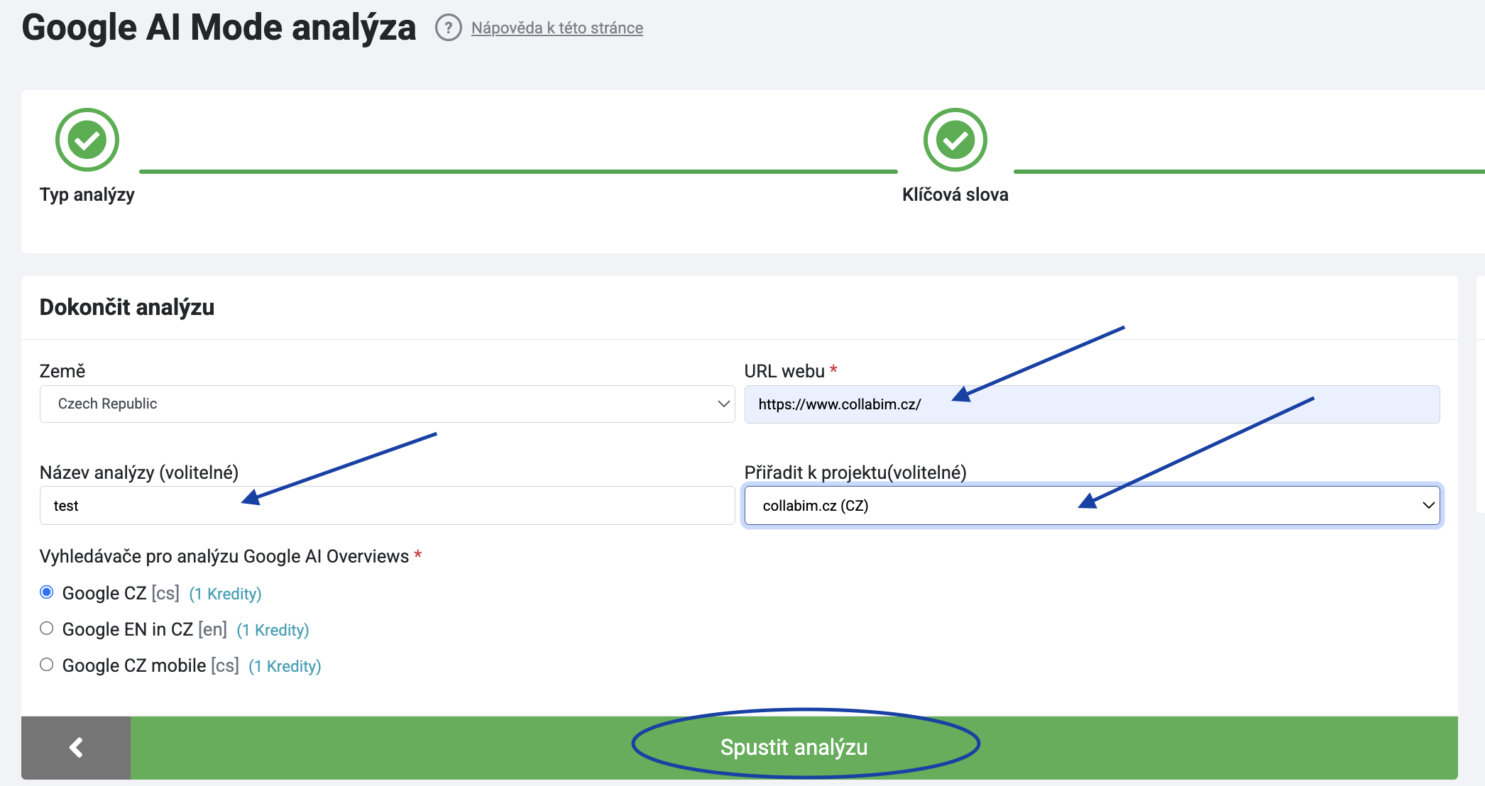 Stačí zvolit druhou variantu, kde vyplníte stejné údaje jako při první analýze. Jen nemusíte vybírat URL, protože analýza kontroluje celý trh a sama najde domény, které vyskakují v AI Mode.