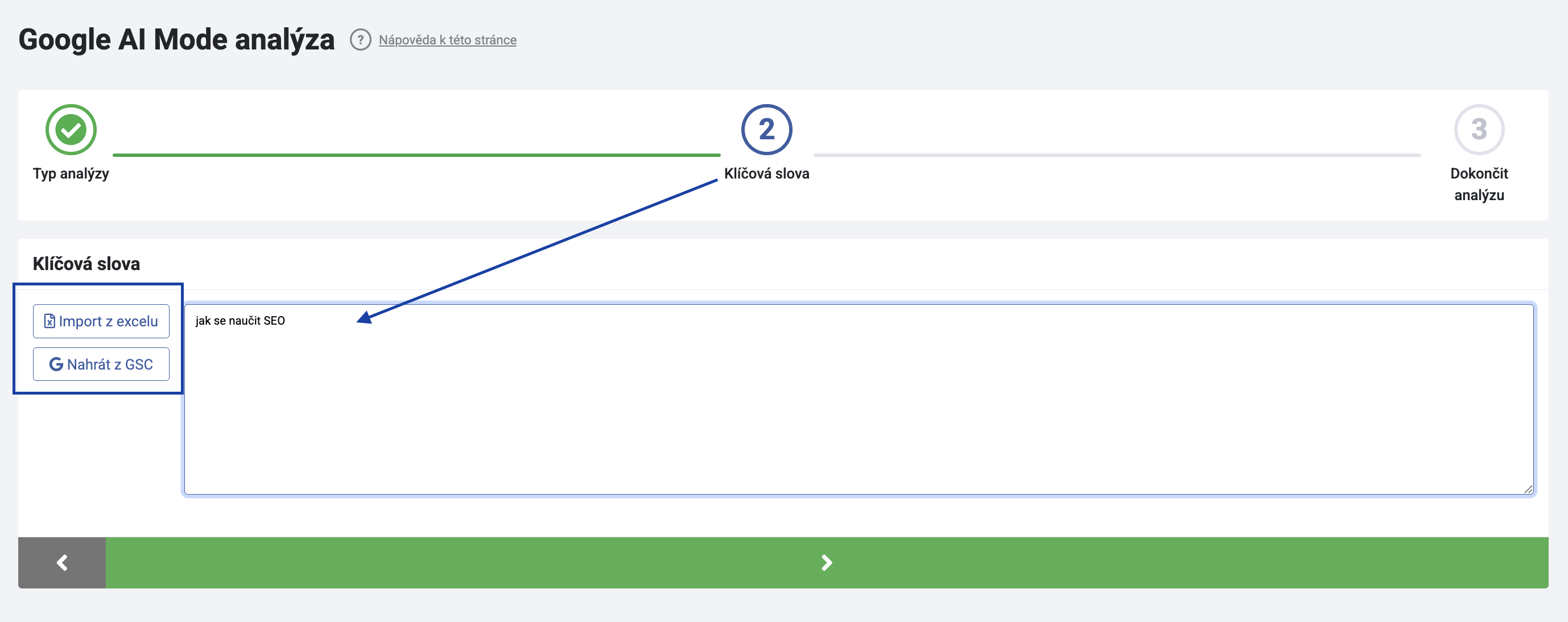 Dále vložte klíčová slova, nebo případně nahrajet slova z excelu/GSC.