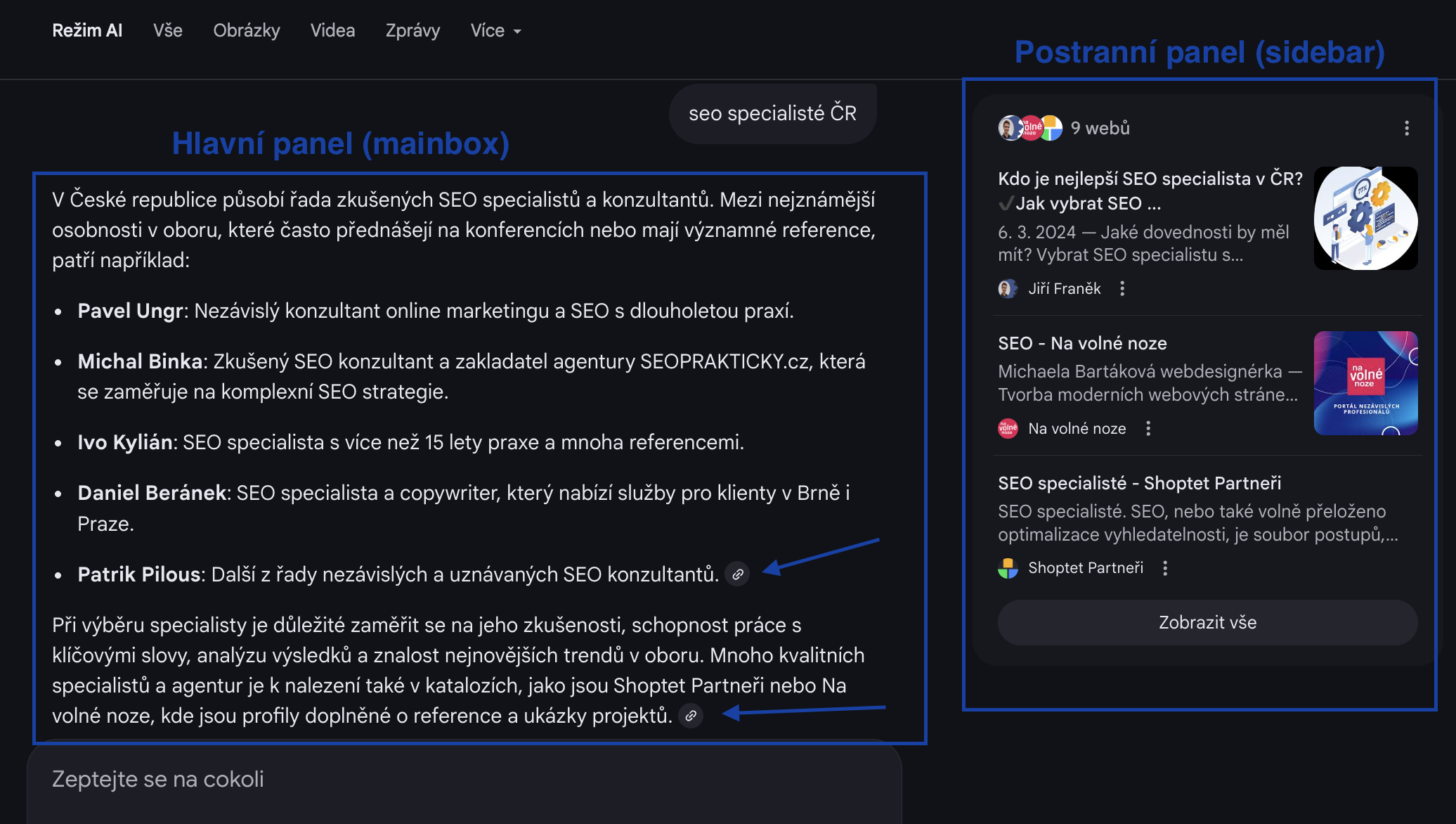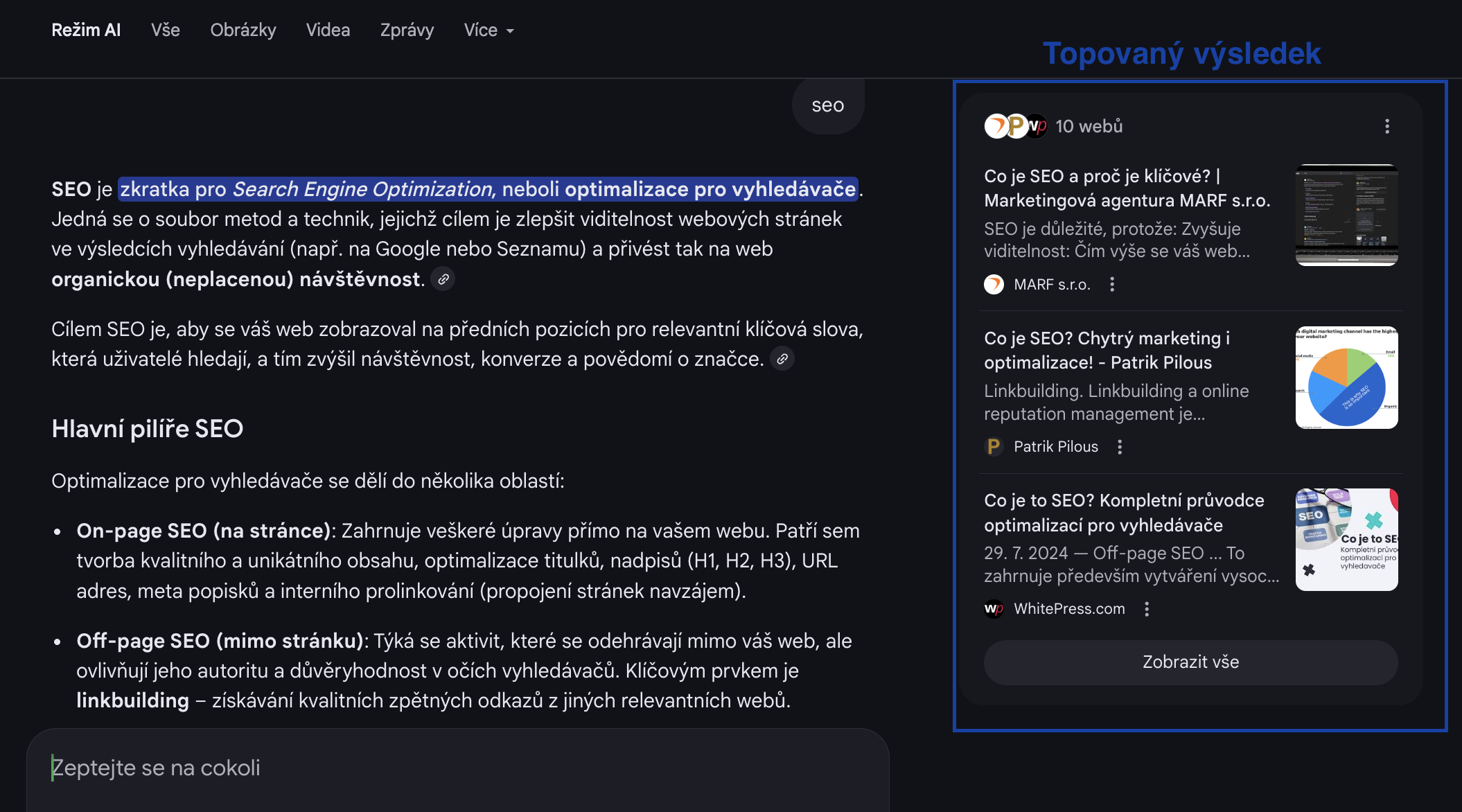 Posledním ukazatelem je tzv. topovaný výsledek, to znamená, že Google v rámci AI Mode vyhodnotí konkrétní web jako hlavní nebo doporučený zdroj informací pro daný dotaz.