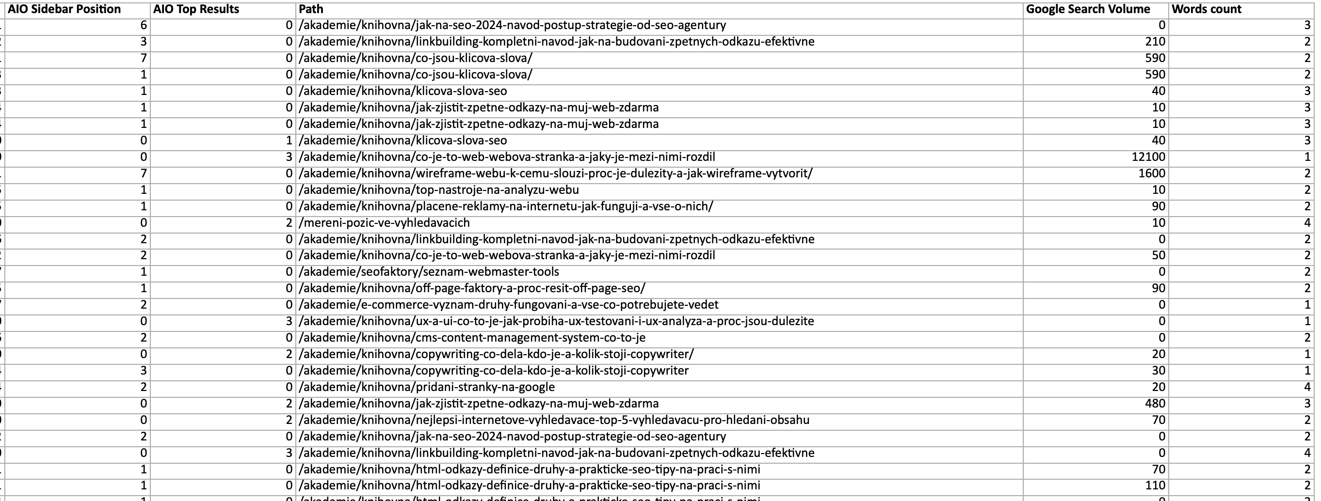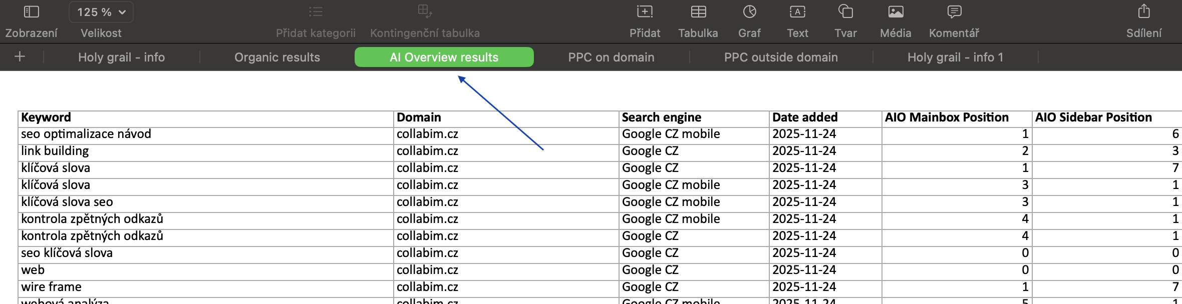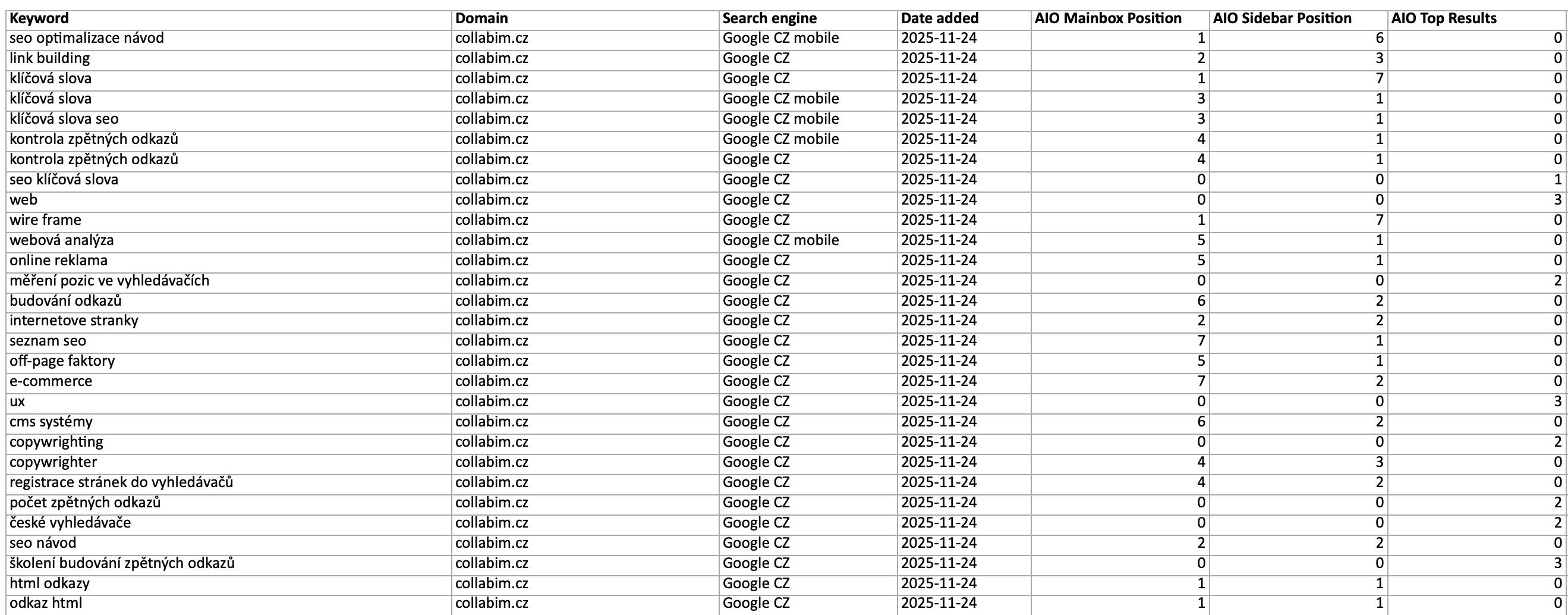 Pokud si vyexportujete tyto výsledky získáte tuto tabulku. Kde najdete klíčová slova, doménu, vyhledávač, datum přidání, pozice v AIO a topovaný výsledek.