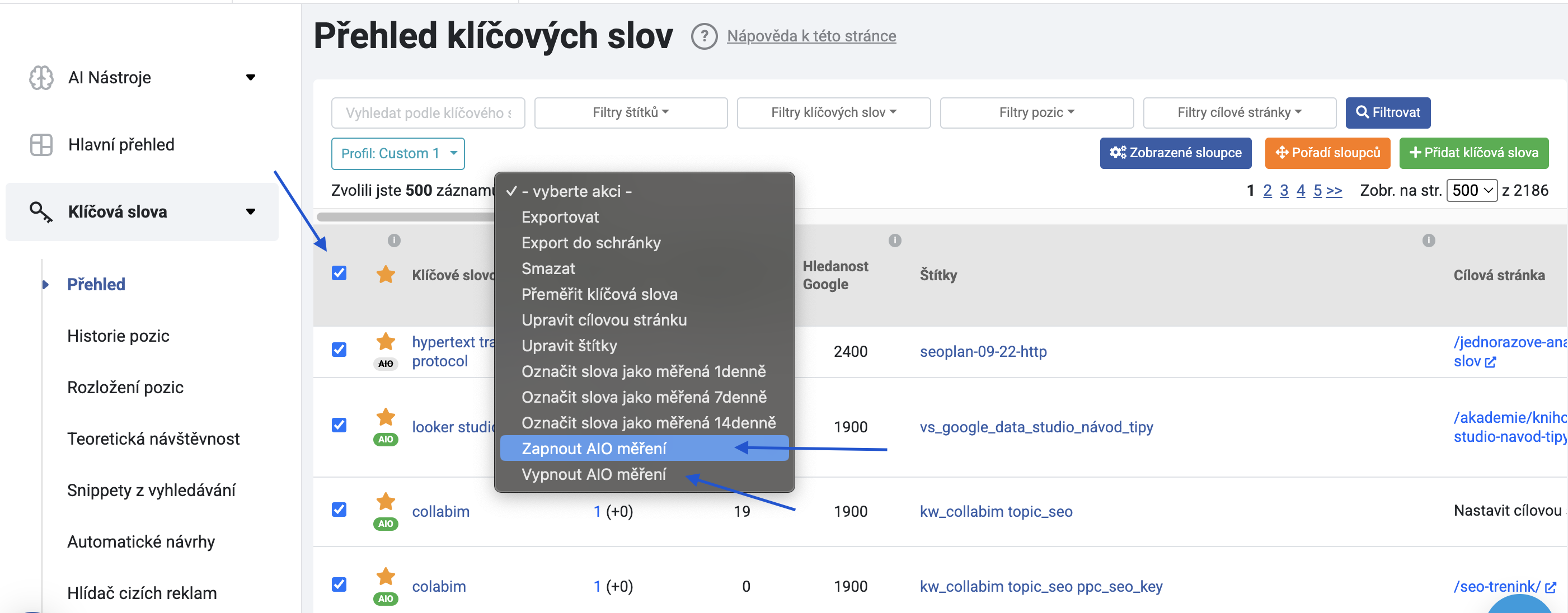 Pokud si přejete hromadně zapnout měření AIO u všech klíčových slov, lze provést tuto akci hromadně. Čtverečkem v šedé liště si označíte všechna klíčová slova a v rozbalovacím okně -vyberte akci- si zvolíte zapnout AIO měření a nabo naopak vypnout AIO měření.